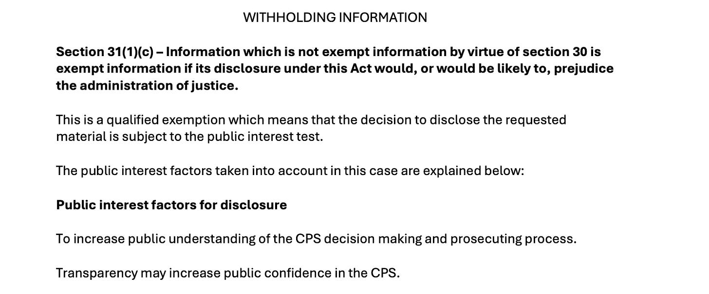 The agency, which prosecutes nearly half a million cases across England and Wales in a calendar year, cited three exemptions under the Freedom of Information Act 2000: Sections 24, 31, and 36.