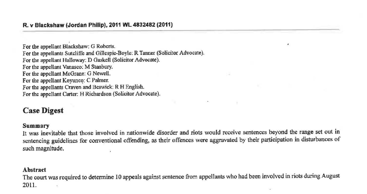 One case related to prosecutions from the 2011 riots, involving several appellants convicted of violent disorder. Two were found to have reportedly incited violence on social media, five were convicted of burglary, and the remainder were charged with possession of stolen goods.