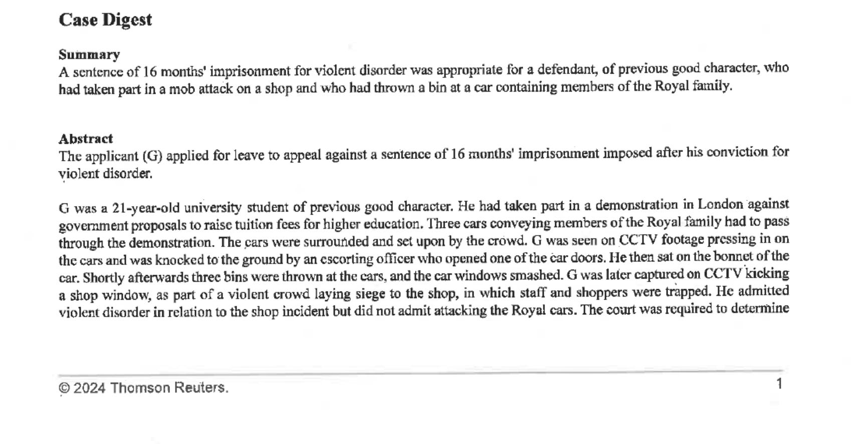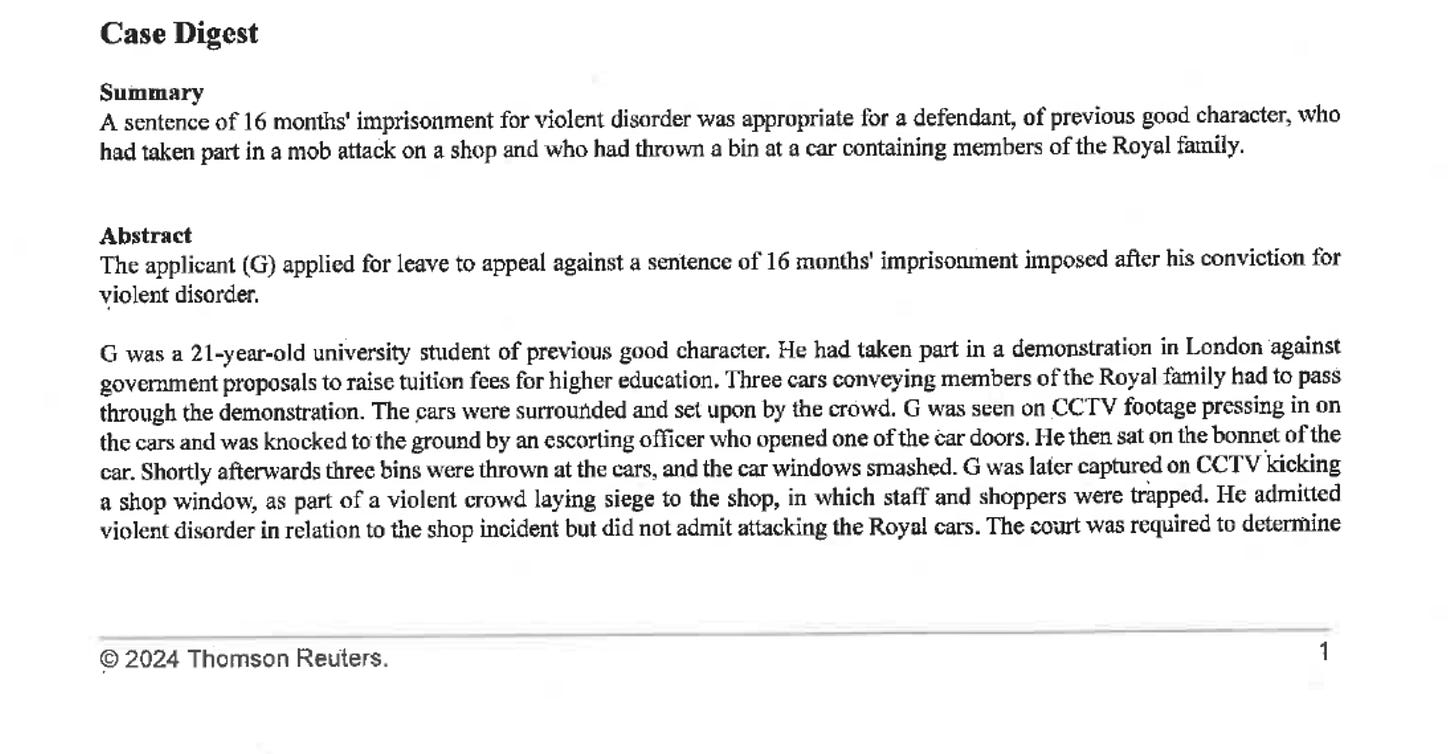 Attached to the response was a selection of case law “provided” to CPS lawyers in connection with offences linked to “violent disorder”.
