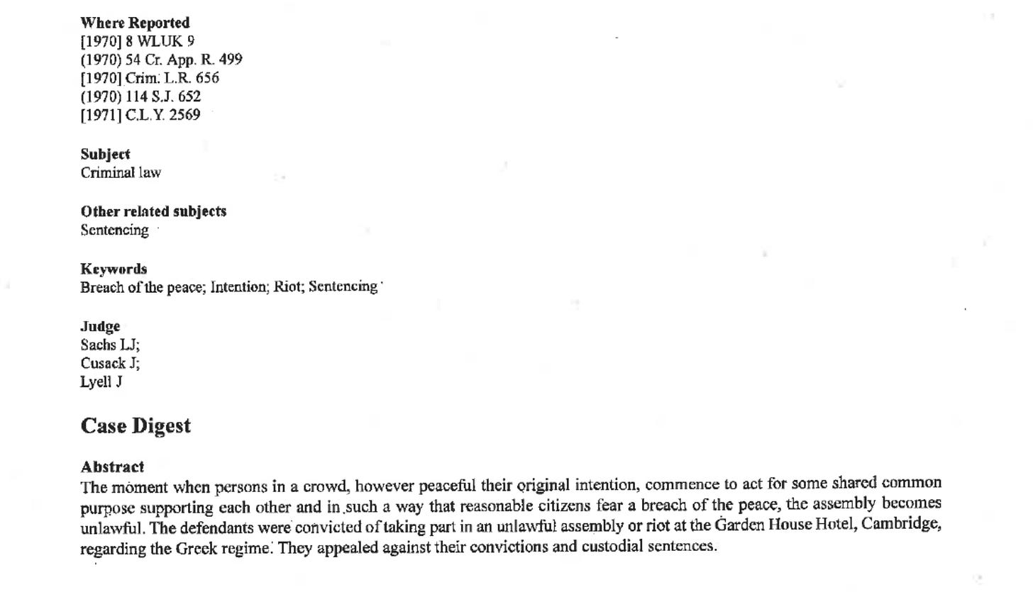 The Court upheld all of the “stern” sentences despite the appellants’ previously good character. The ruling also established that if a group of peaceful individuals begin to act with a “shared common purpose,” and ordinary citizens “fear” a breach of the peace, the assembly becomes unlawful.